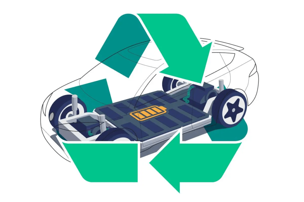 電気自動車バッテリーのリサイクル工程とリチウム抽出・回収技術を示したイラスト